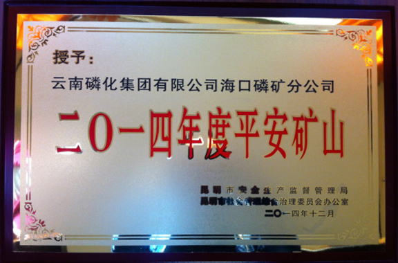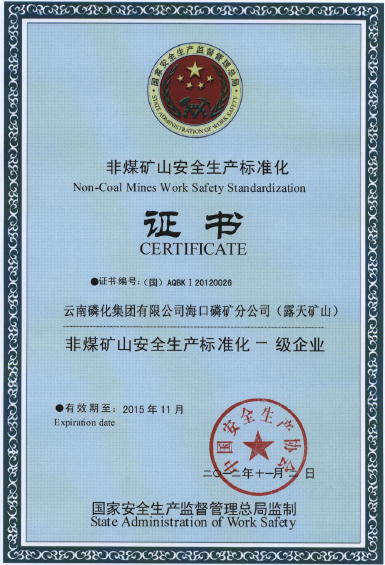 近年來,海口磷礦通過強化管理,先后通過了國家IS9001-2000質量管理體系、IS14001-2004環境管理體系和GB/T28001-1999職業健康安全管理體系認證、“金屬非金屬礦山安全標準化一級企業”驗收及“清潔生產”合格單位的升級驗收。2011年5月被批準為國家“綠色礦山公約”成員單位,成為首批國家級“綠色礦山”。
